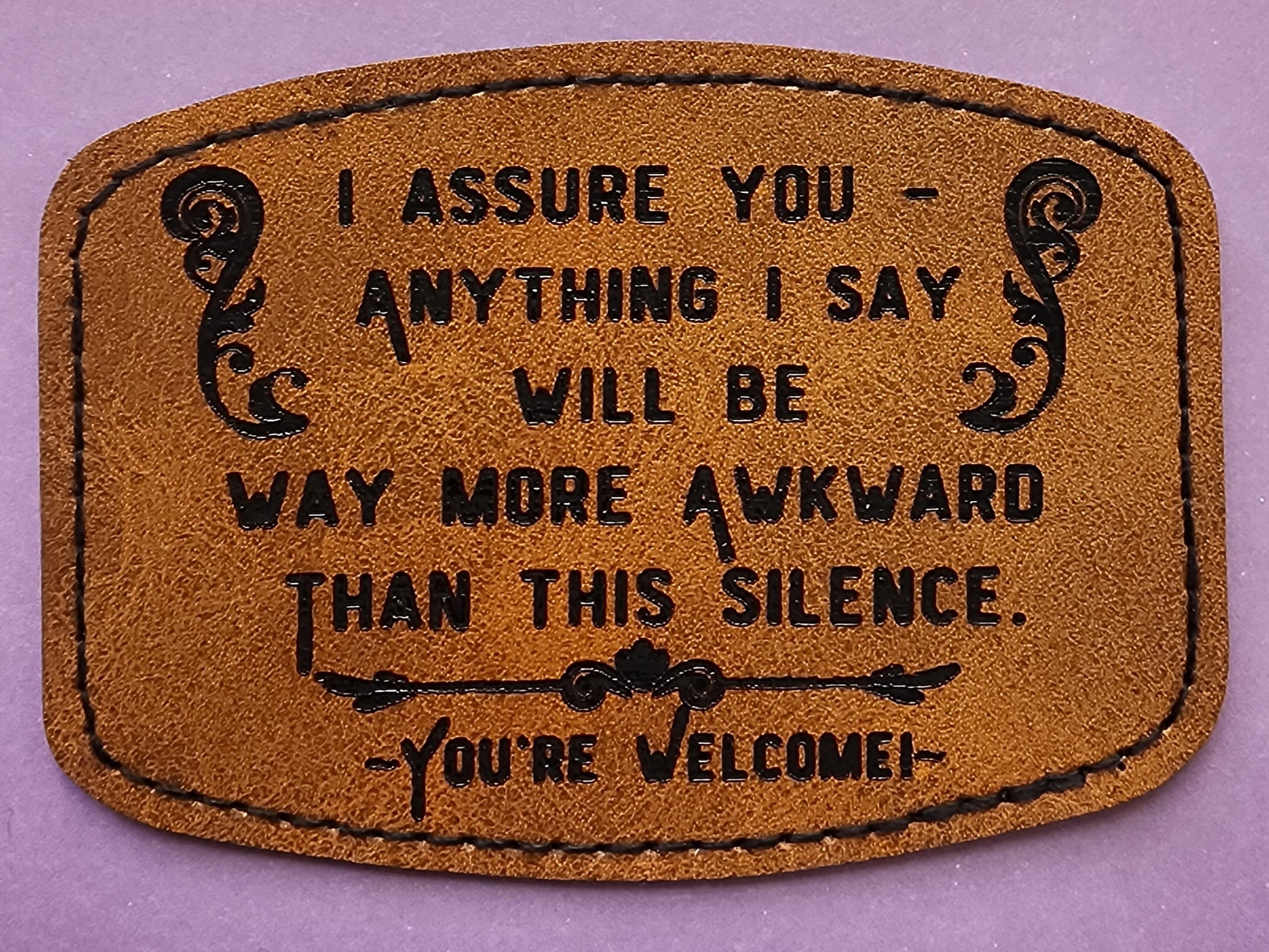 Awkward silences aren't always bad—sometimes they're just the universe telling you to be grateful for the quiet. This 2.75 x 3.75 iron-on leather patch brings a little wry wisdom to your jacket, backpack, or anywhere else you need a subtle reminder that not every moment needs filling. Stick it on and let the message do the talking.