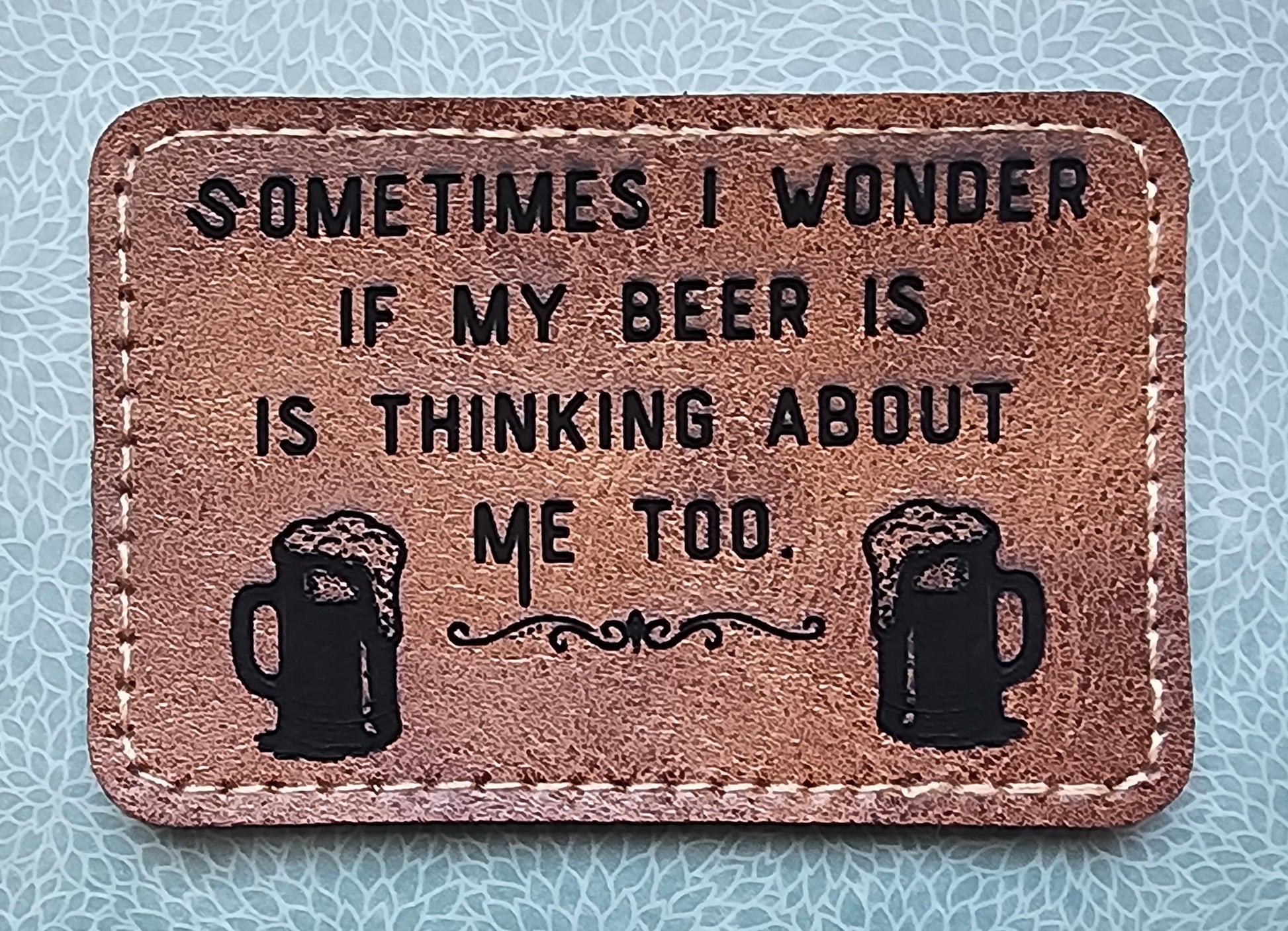 Sometimes I wonder if my beer is thinking about me too—and now you can wear that existential crisis on your sleeve. This 2x3 inch leather iron-on patch features a cheeky engraved message paired with beer mug imagery, perfect for customizing jackets, bags, or anywhere else your philosophical beverage musings deserve a home. Durable leather construction and easy application make it a conversation starter that sticks around.