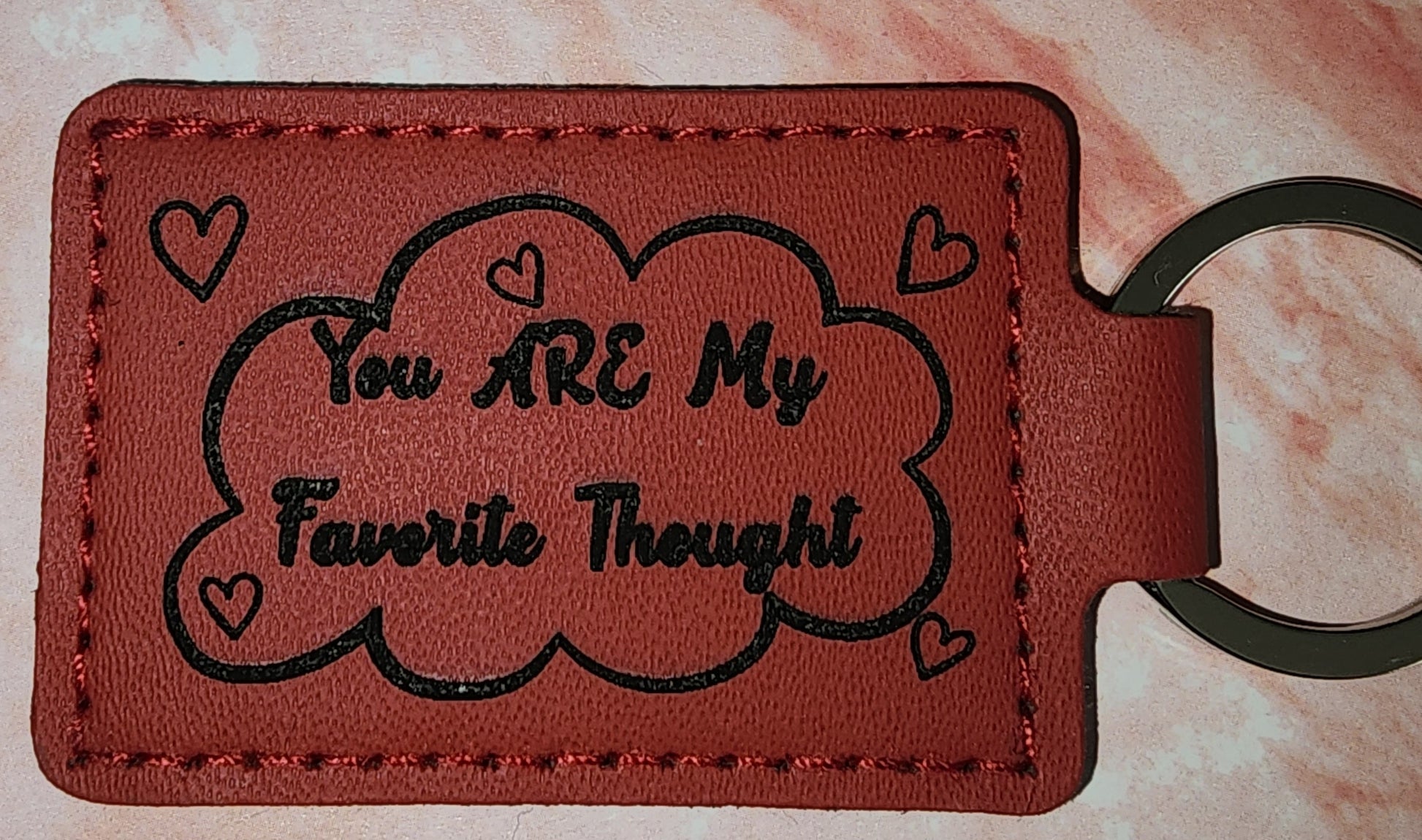 Keep your favorite person close—literally. This 2x3" leather key tag arrives engraved on both sides with "You ARE my favorite thought," complete with a whimsical thought cloud and scattered hearts. Durable steel split ring keeps it attached to keys, bags, or wherever you stash your essentials. Perfect for the person who lives rent-free in your head.