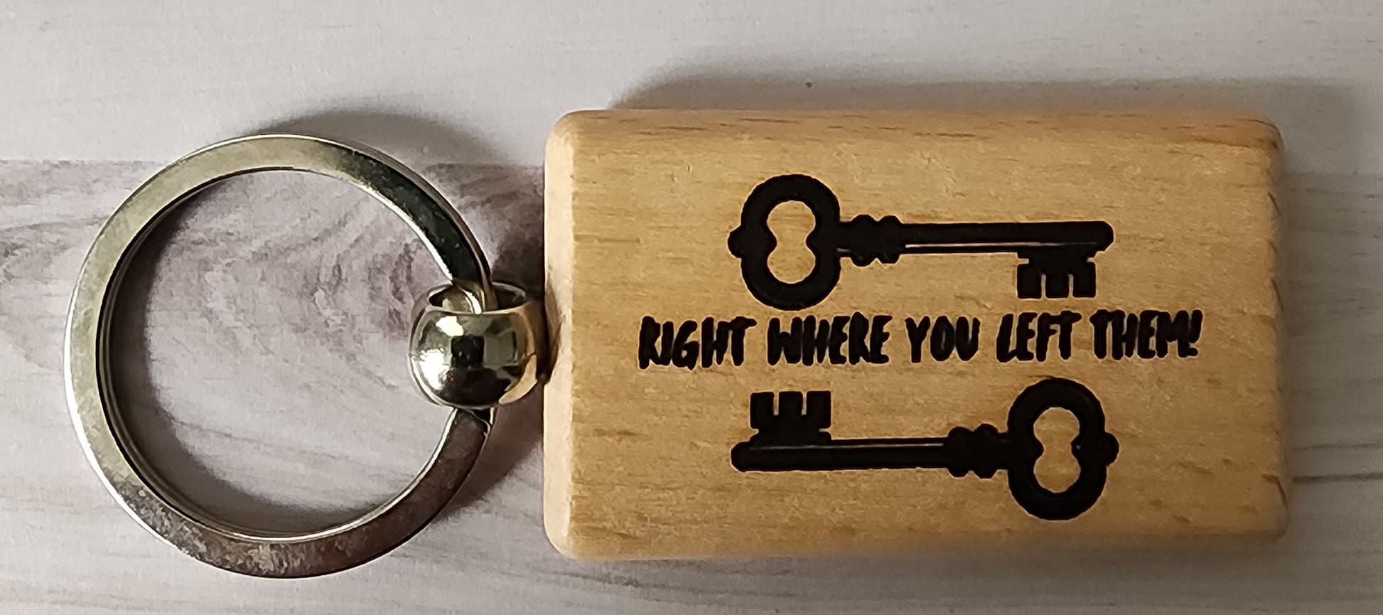 Stop losing your mind over lost keys. This rugged wooden tag—engraved on both sides with "right where you left them"—clips to your keyring with a sturdy split ring and serves as a gentle reminder that your keys aren't actually gone, just temporarily misplaced. At roughly 1x3 inches, it's small enough to slip into a pocket but bold enough to catch your eye when you finally retrace your steps. Perfect for the chronically forgetful who always find them anyway.