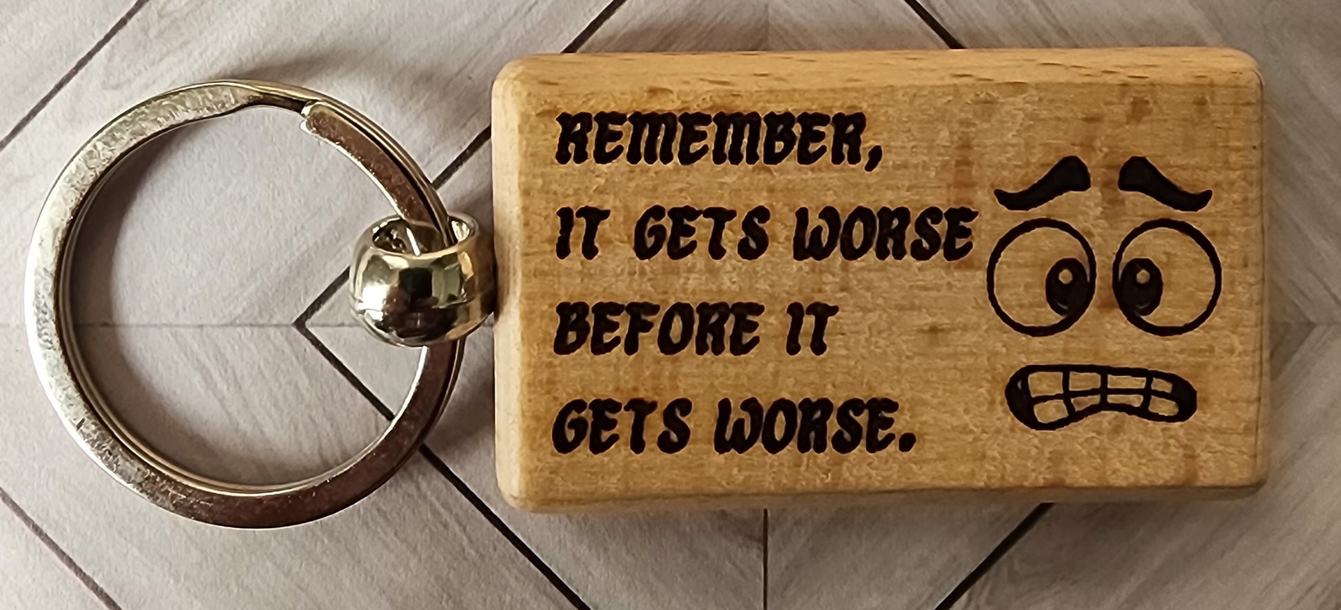 Wooden keychain engraved on both sides with a darkly honest reminder: "Remember – it gets worse before it gets worse." Measuring roughly 1" × 3", this little dose of reality pairs perfectly with your keys, bag, or desk. Finished with a durable steel split ring. No inspirational platitudes here—just a wry companion for anyone who appreciates humor that doesn't sugarcoat life.