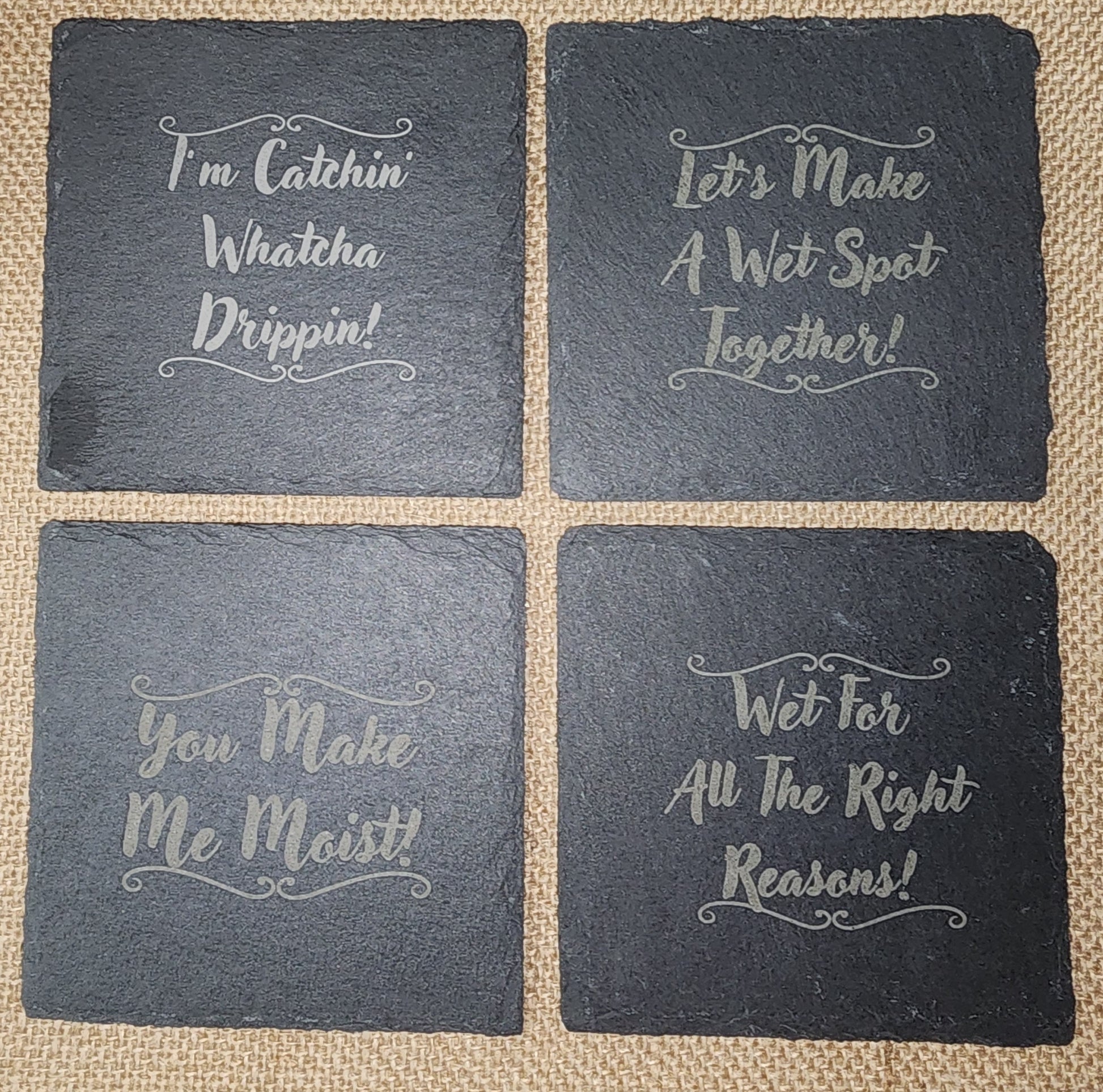 Set of four square slate coasters, each roughly four inches across with protective felt pads on the bottom. Every coaster features a cheeky, irreverent engraving loaded with innuendo—because your drinks deserve witty company. Durable natural slate keeps glasses safe while adding a playful edge to any table. Perfect for folks who appreciate humor with their hydration.