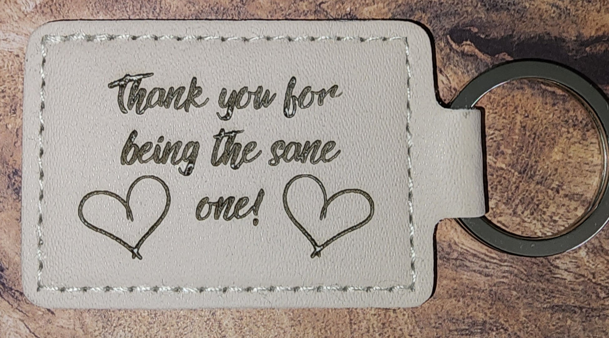 A witty thank-you gift for your favorite voice of reason. This 2x3" leather keychain features a steel split ring and laser-engraved messaging on both sides: "Thank you for being the sane one" adorned with hearts. Perfect for the friend who keeps you grounded, the sibling who talks sense, or anyone who deserves recognition for their steady wisdom. Durable leather and quality hardware ensure it'll survive years of pocket duty.